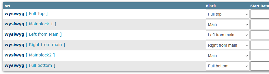 Die Einträge direkt hinter wysiwyg: hast Du die da "einmontiert"?Weil, ich habe es wirklich getestet: [Mainblock 1] und [Mainblock 2] werden gesamt ausgegeben, wenn Du das testest, dann müsstest Du den Inhalt dieser beiden Abschnitte auch direkt untereinander haben.